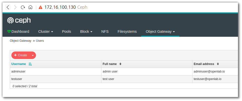 이제 다시 dashboard의 object gateway로 접속해보면 다음과 같이 생성했던 adminuser와 testuser가 확인되어진다.