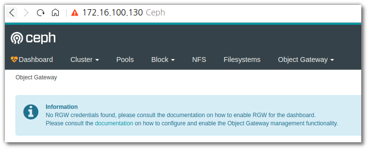 dashboard가 동작되는것은 확인되지만 안타깝게도 아직 아래와 같이 object gateway의 메뉴상에 보여지는것은 없다.