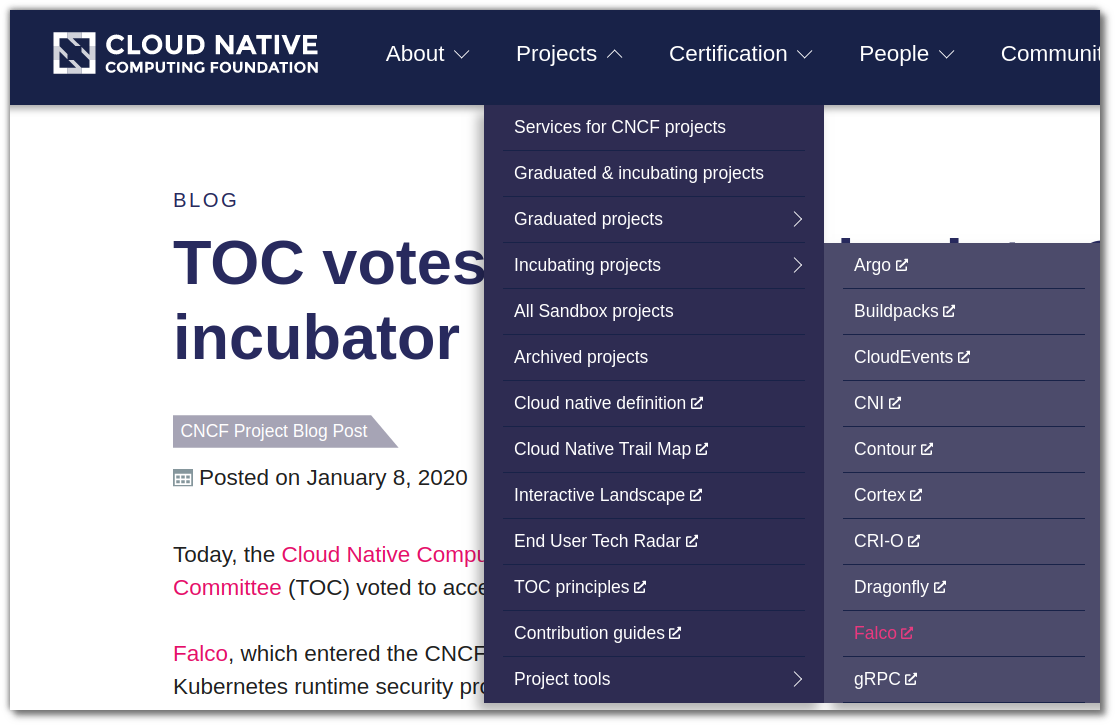 2018년도 부터 시작되었고 sysdig에 의해 CNCF에 기여되었다. 현재는 incubating 과정에 있는 project이다.