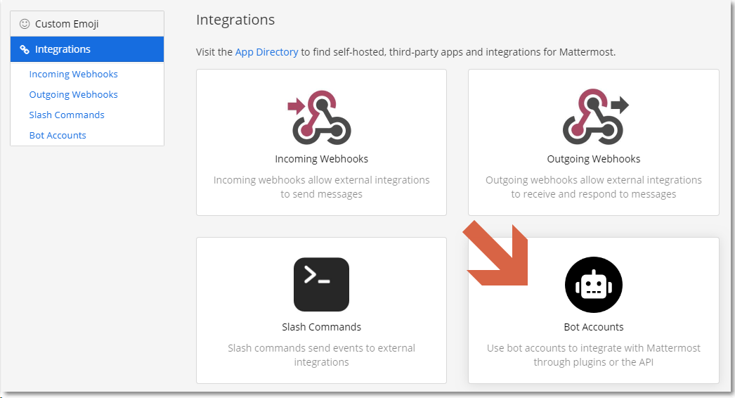 Mattermost App이나 Web Browser에서 Integrations 메뉴로 이동한다.(로그인된 사용자는 관리자 권한이 있어야 한다.)