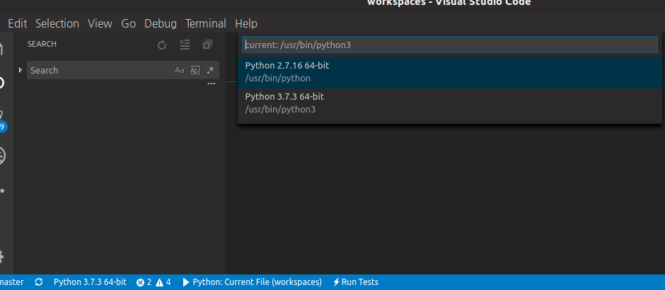 여기서 좌측 하단에 "Python 3.7.3 64-bit"을 선택하면 설치되어 있는 Python 버전이 출력되고 이를 선택하여 실행해볼수 있다.