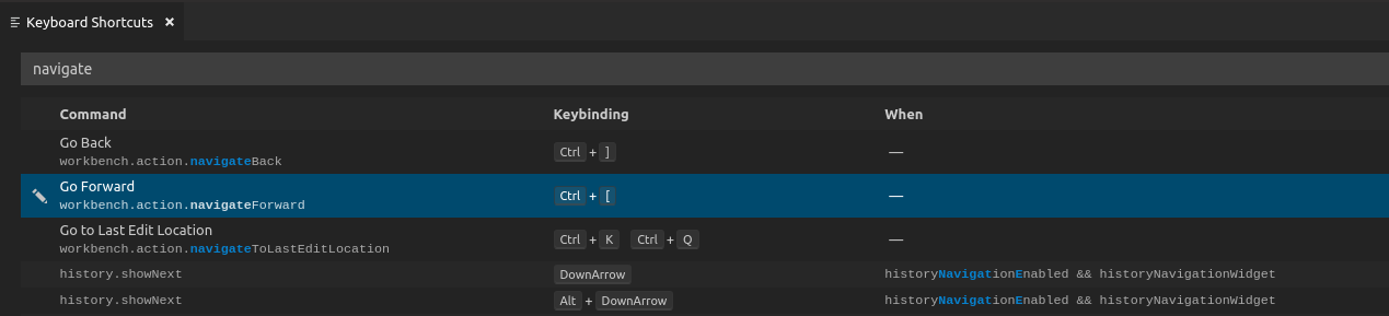 개인적으로 개발할때 VIM을 도구로 사용했던터러 해당 shortcut에 익숙하여 VSCode의 navigate shortcut 도 이와 같이 변경하고자 한다. 하여 아래의 설정을 변경하여 동일한 경로는 [File] -> [Preferences] -> [Keyboard Shortcuts] 로 이동하면 아래와 같은 화면이 출력된다.