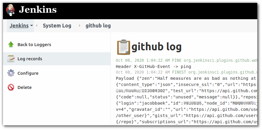 위와 같은 log가 github webhook이 발생될때마다 출력되게 된다.