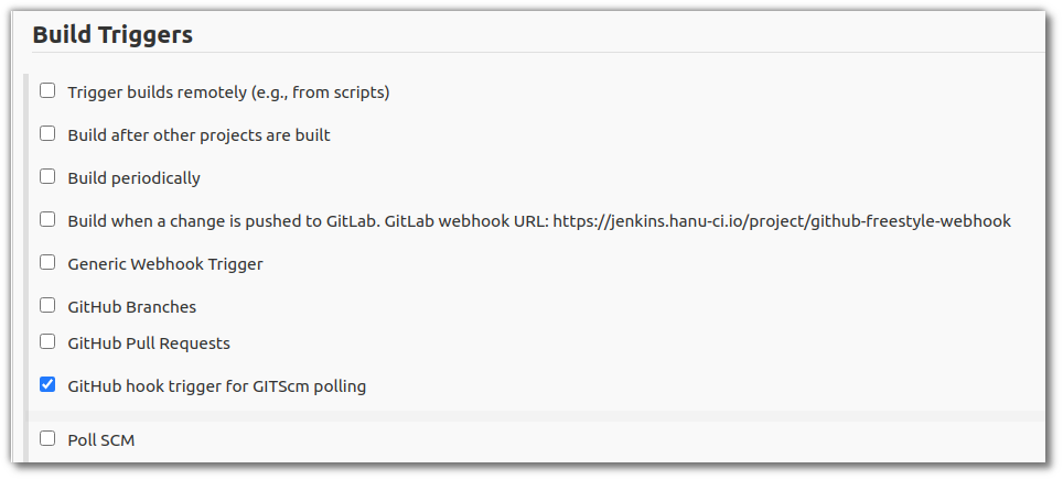 freestyle job을 생성 (해당 job은 build other projects를 post-build actions으로 지정)하고 아래 trigger 설정을 추가한다.