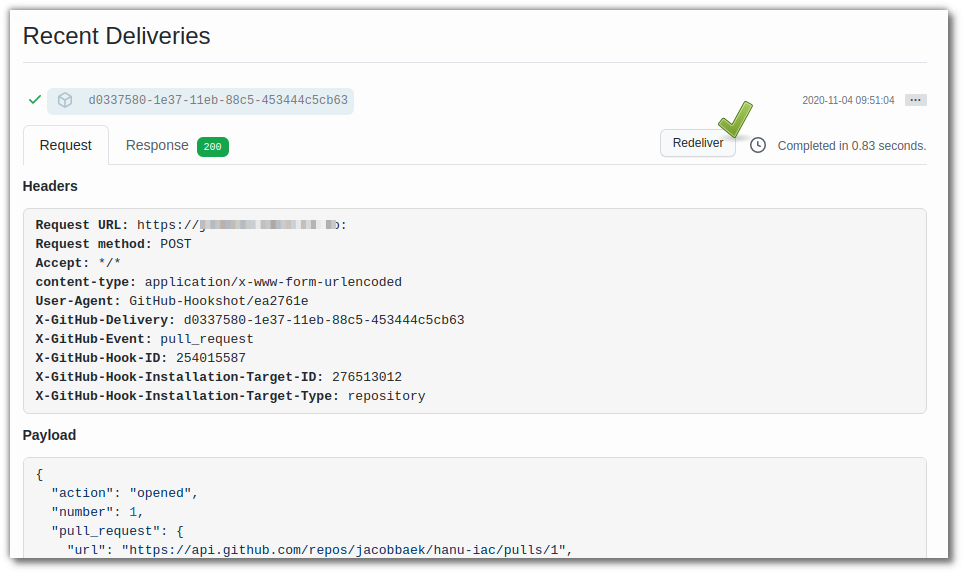 이때 정상적으로 webhook 호출이 안되는 경우는 이유를 확인 및 해결하고 최하단에 보이는 실패된 delivery를 클릭하여 들어가 redelivery를 수행해보면 다시 webhook 호출을 수행하기 때문에 이를 통해 확인할수 있다.